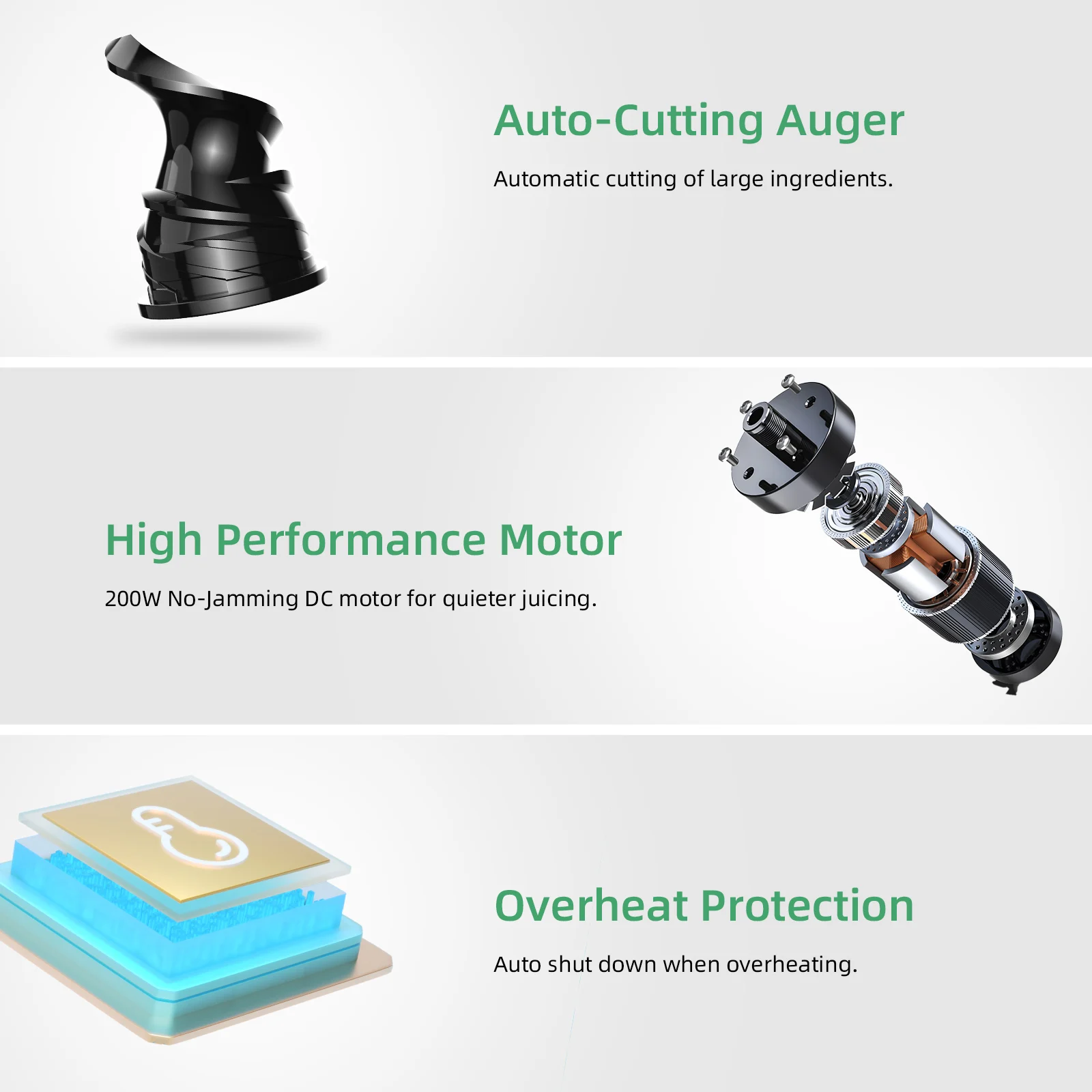 [静かな操作]- DCモーターはACモーターより静かに動作し、操作中のノイズが少ないため、静かなジュース体験を好む人に最適です。